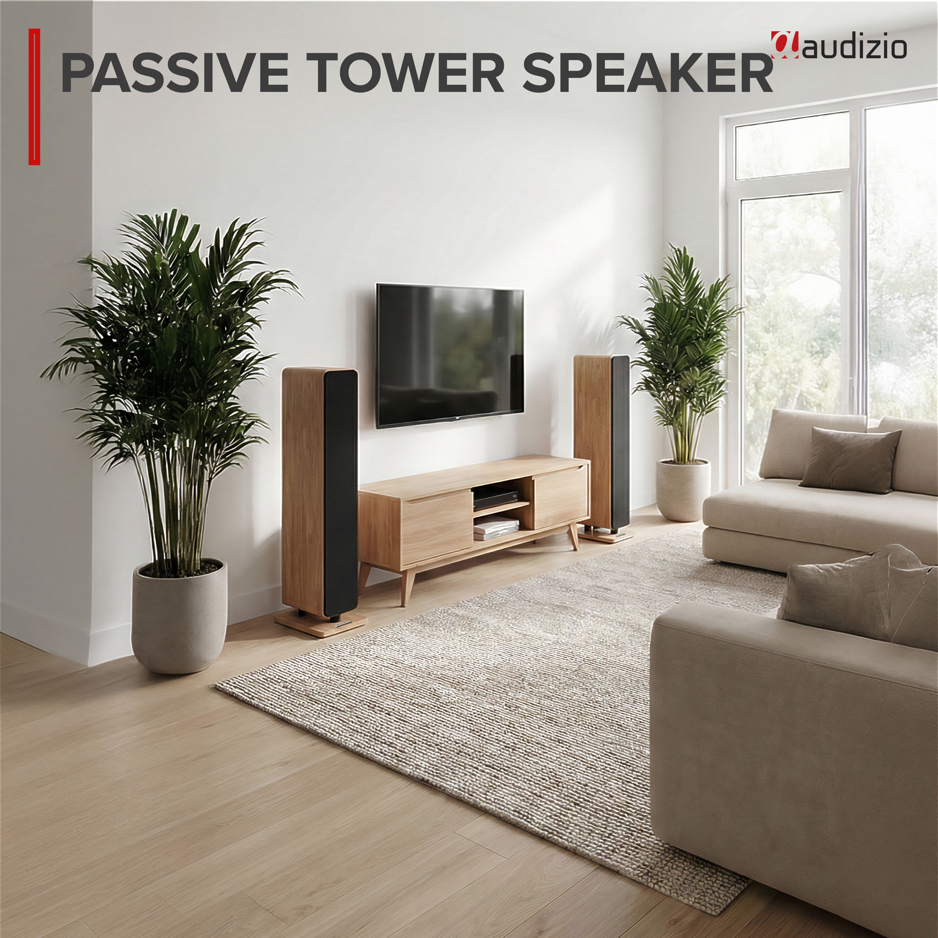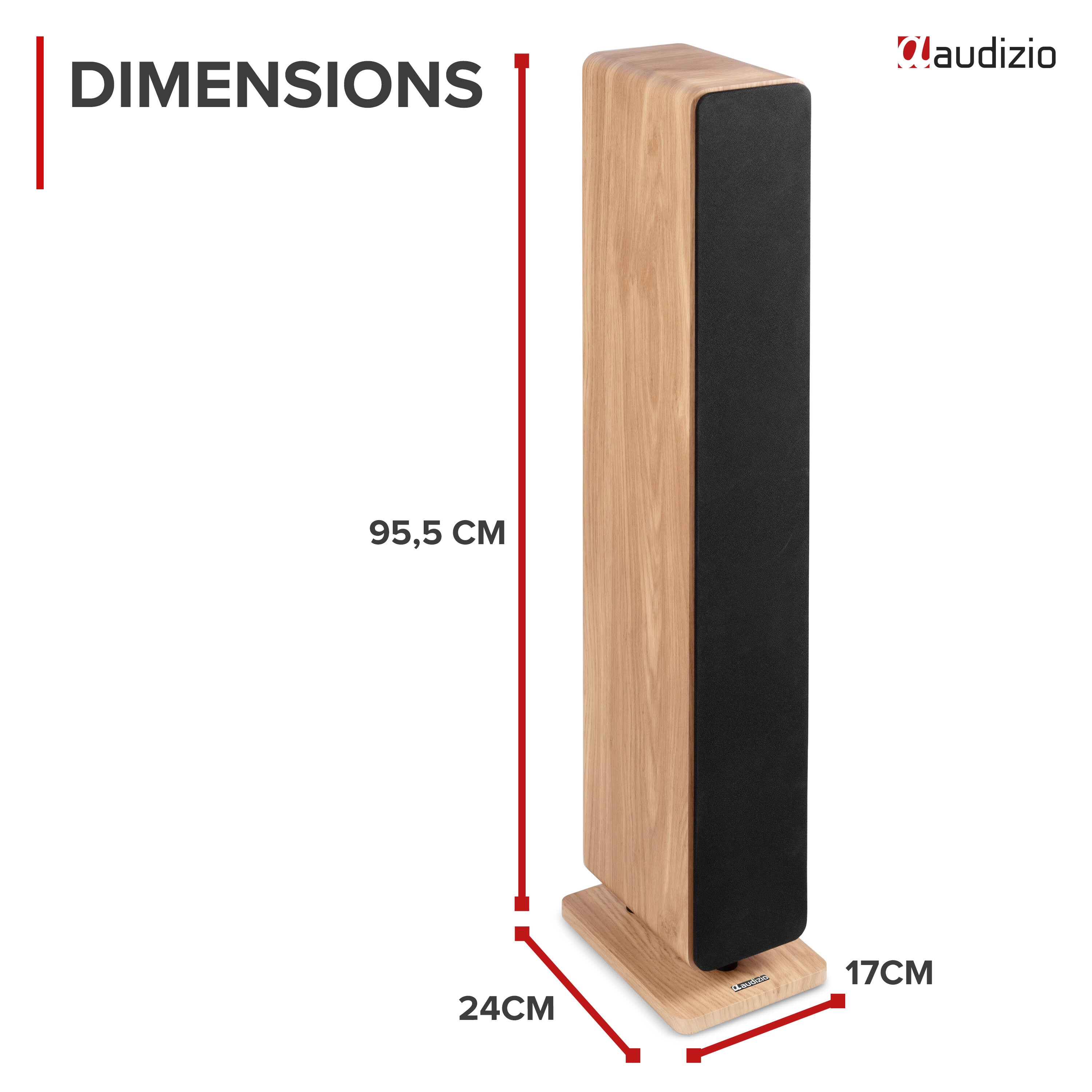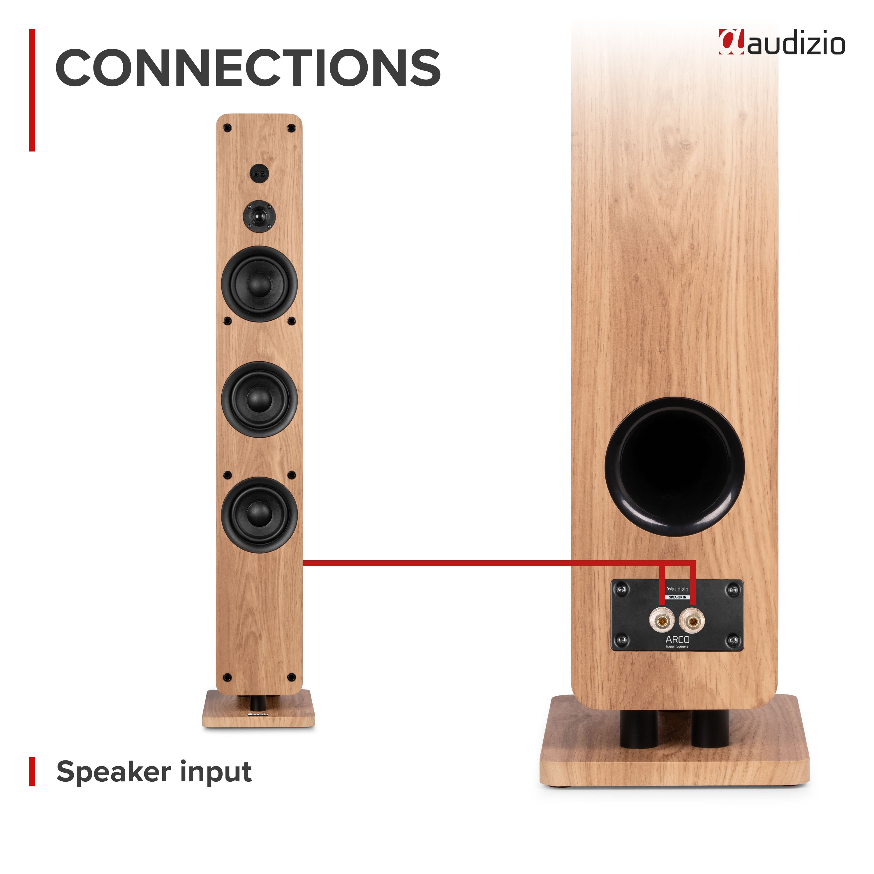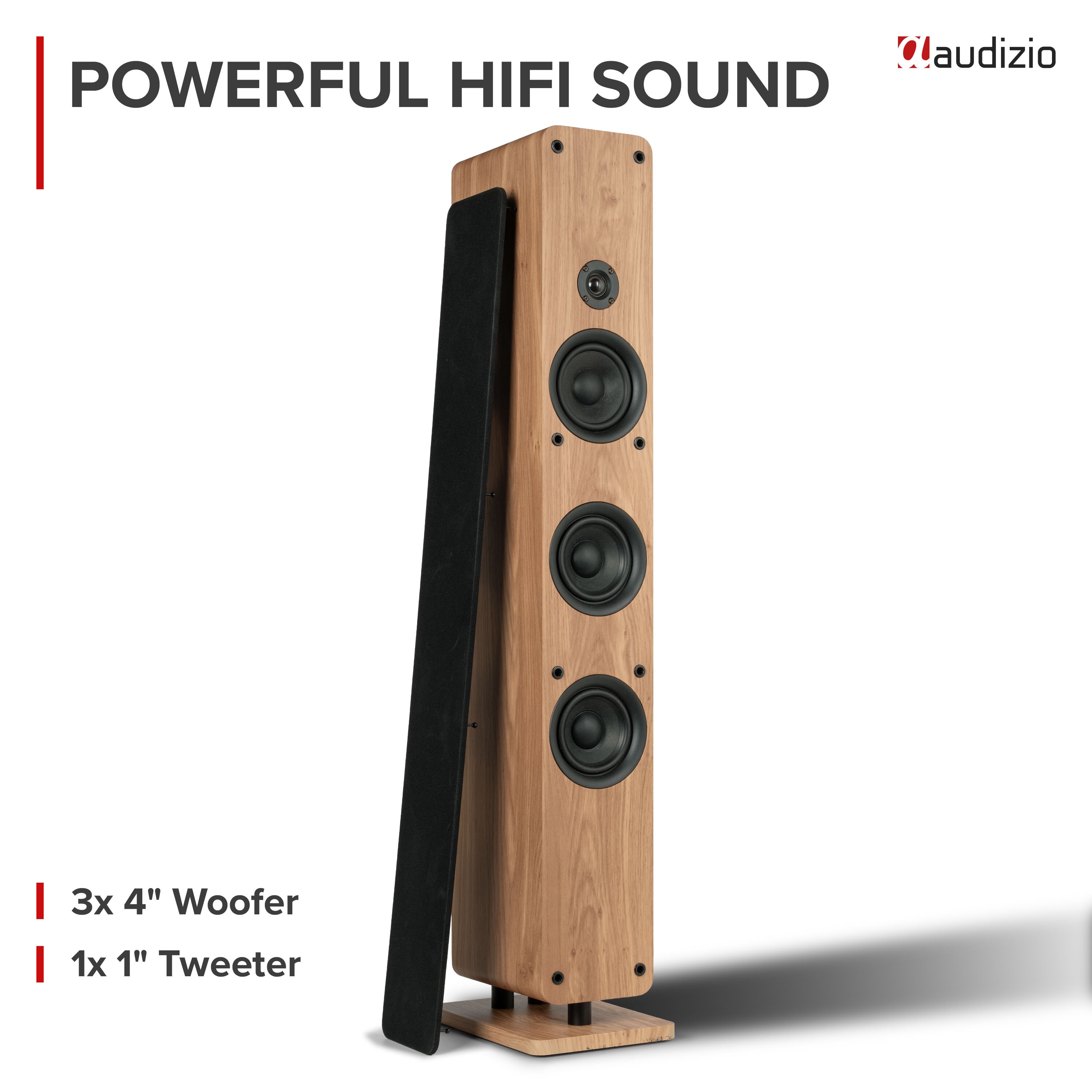 • Audizio ARCO Tower Speaker-serien kombinerar modern design med imponerande ljudkvalitet. Den passiva ARCO Tower Speaker i ljus träfinish är utformad för att smälta in i hemmets inredning samtidigt som den levererar fylligt och rumsfyllande ljud.