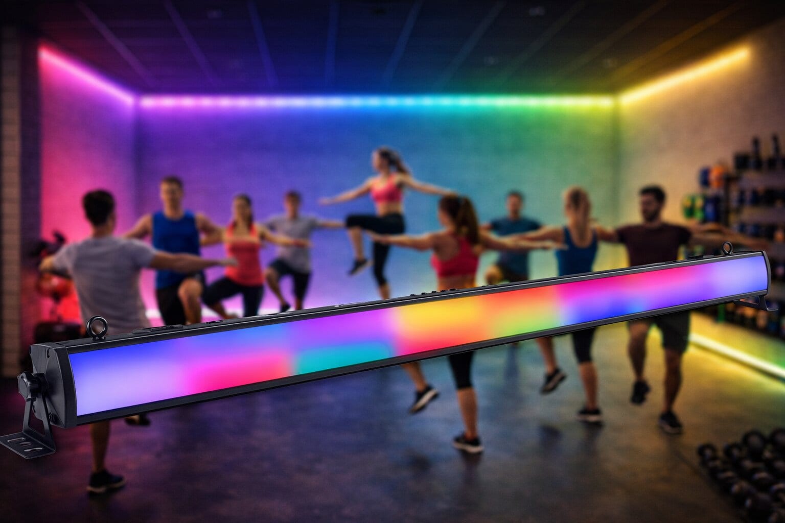 Ge din träningslokal en snygg och effektfull ljussättning! Med rätt belysning kan du skapa en energifylld nattklubbskänsla till er träning, där ljuset pulserar eller rör sig mjukt i takt med musiken eller via förvalda program. Möjligheterna är många – från färgsättning av väggar till spektakulär stämningsbelysning för olika träningspass och evenemang.
