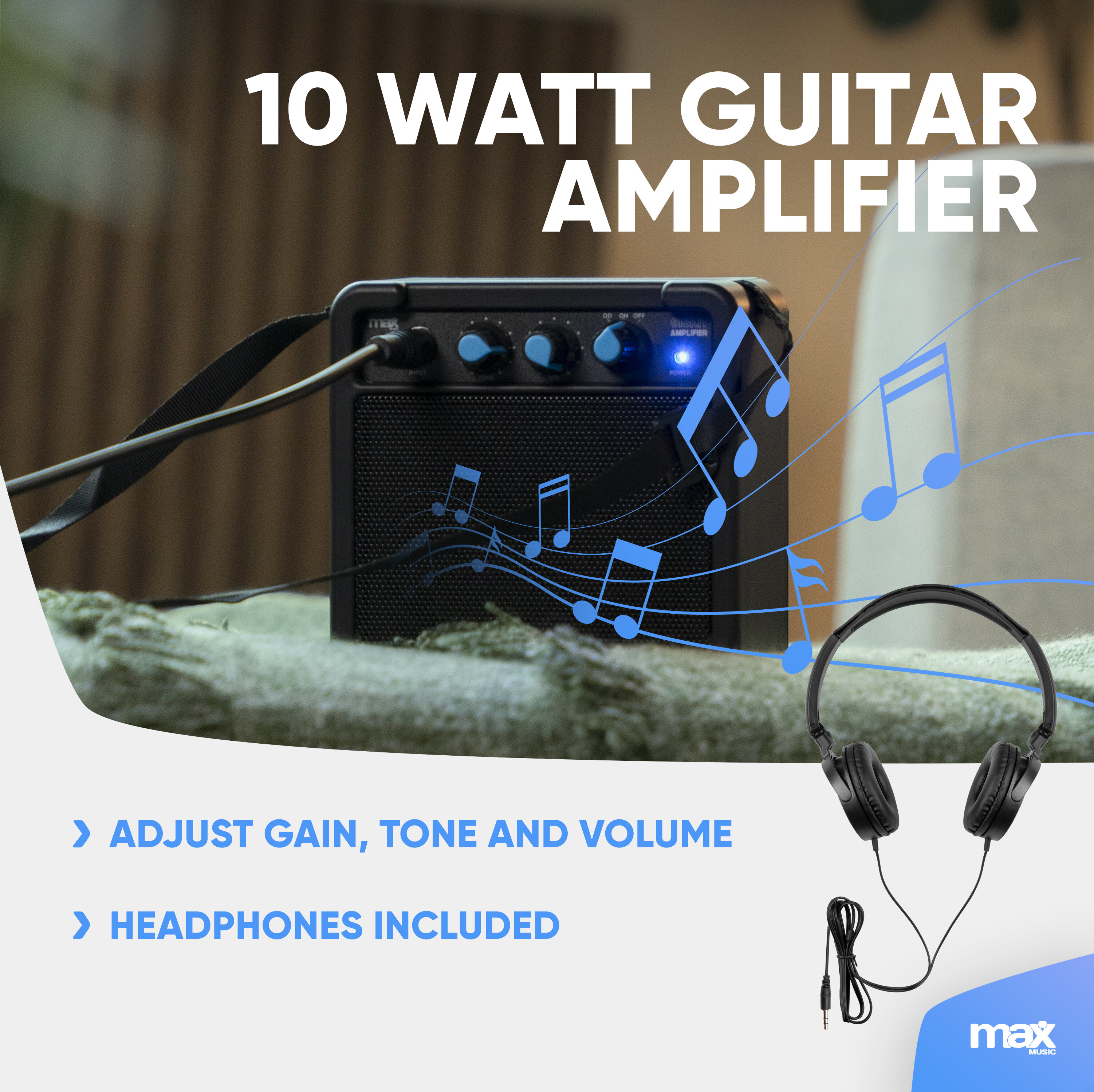 Setet innehåller en 10-watts gitarrförstärkare som levererar ett klart, kraftfullt ljud för sin storlek. Du får både rena toner och lätt dist via enkel volym- och tonkontroll. Paketet levereras komplett med väska, stämapparat, axelrem, plektrum, extrastängar, anslutningskabel och justeringsverktyg – allt som behövs för att komma igång direkt.