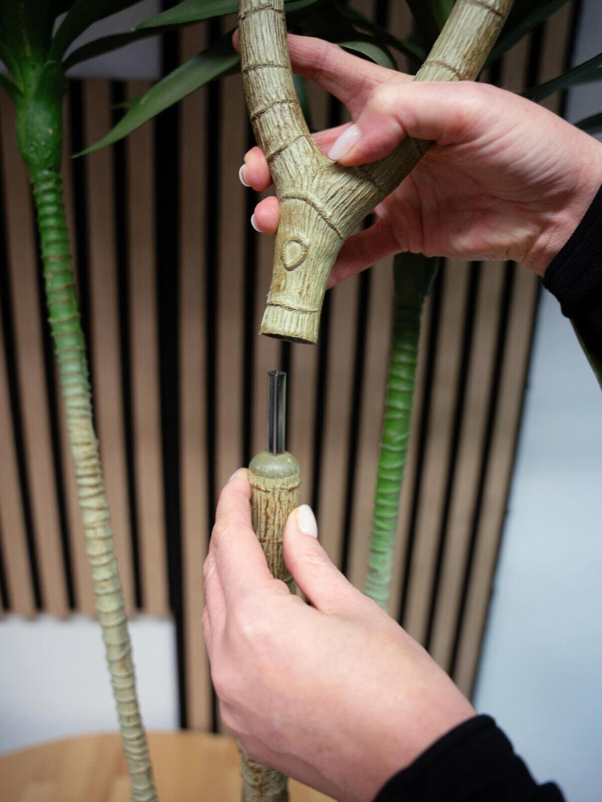 The Dracena, also known as the dragon tree, impresses with its slender stems and long, narrow leaves, which give it an expressive and elegant presence. Due to this growth habit, it is a popular indoor greenery.The artificial version from Europalms is an easy-care alternative to the real plant and is made entirely from plastic. Three stems are arranged in a simple plant pot, with the middle one branching out several times in the upper section. This ensures a particularly lush and lively appearance. At the same time, the leaves underline the elegant look of the artificial plant with their natural-looking coloring and set stylish accents. Whether as an elegant decorative element in the living area, as a modern design element in offices or as stylish greenery in catering areas - it adapts effortlessly to any environment.Thanks to a clever solution that ensures space-saving packaging, only the head of the central section needs to be inserted into a marked stem when setting up the artificial plant.