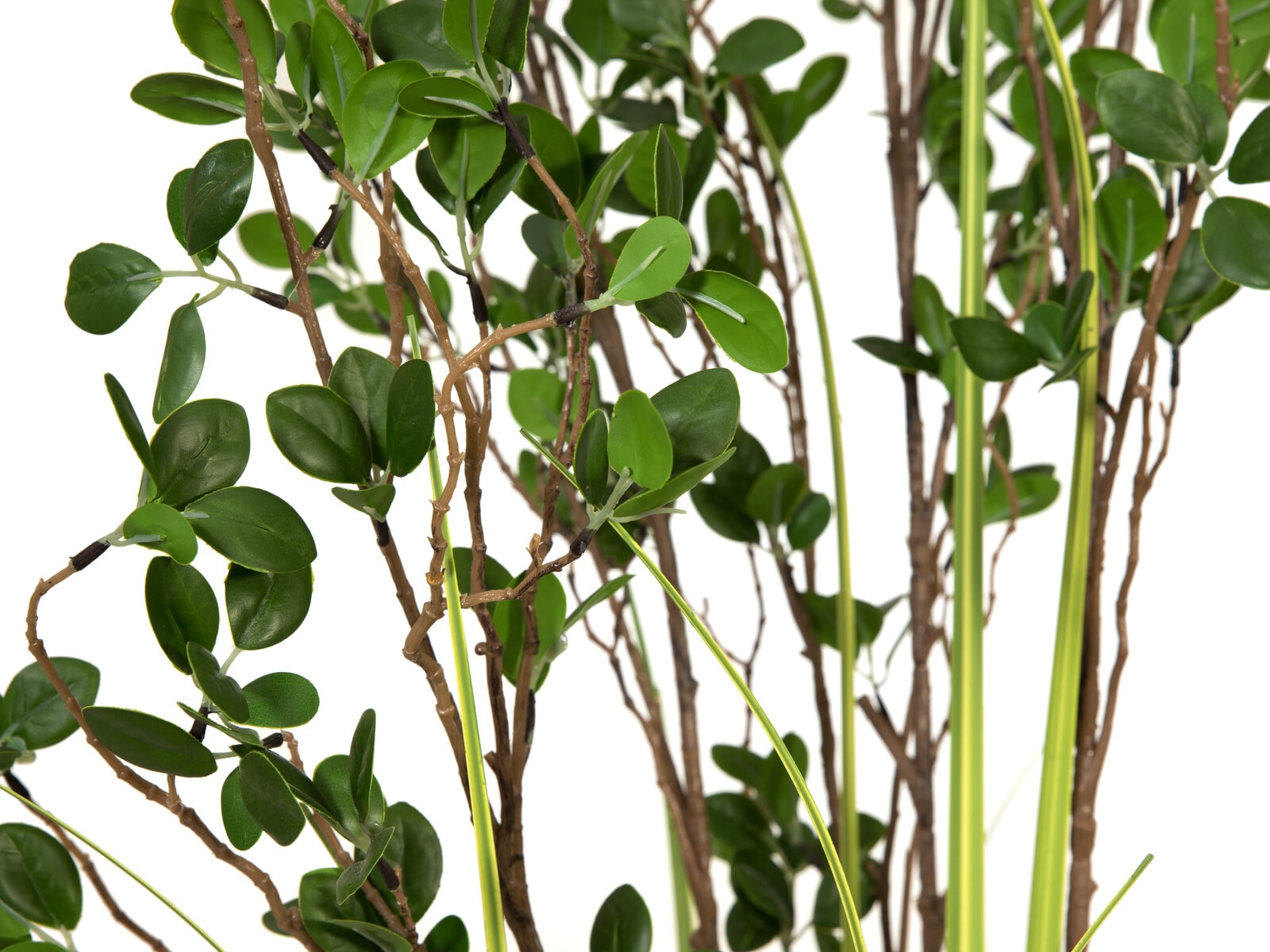 Set targeted green accents with the artificial evergreen shrub from Europalms.In the twinkling of an eye, you can create a pleasant atmosphere even in simply furnished office and living rooms.The branches of the evergreen spindle shrub protrude from a light green grass bush, whose PE leaves, graduated in length, already fall into shape by themselves when placed. The varying shades of green between the grass and the leaves of the shrub gives the plant a simple elegance and balanced appearance.The arrangement has a total height of about 152 cm and comes in a black gardener's pot, which gives the plant a stable stand when placed in a planter. A deceptively realistic cover with artificial moss completes the lifelike appearance.
