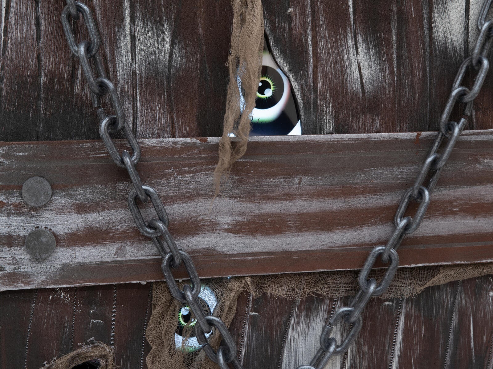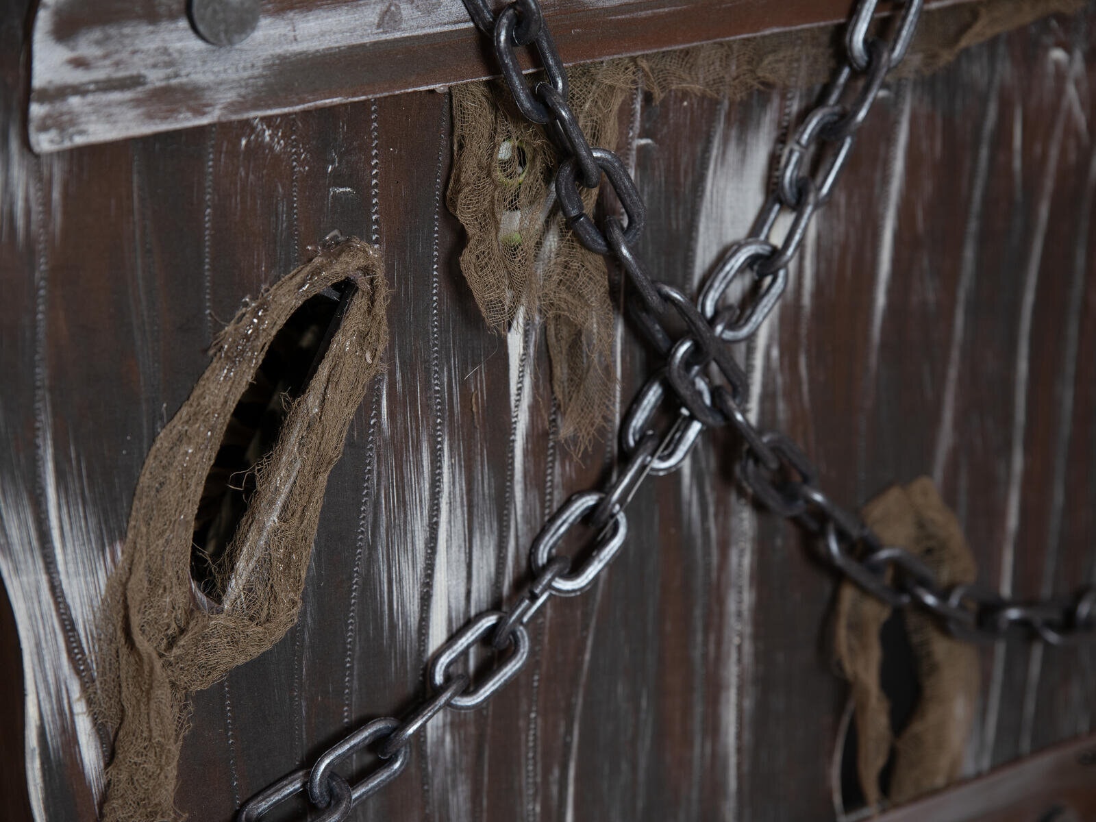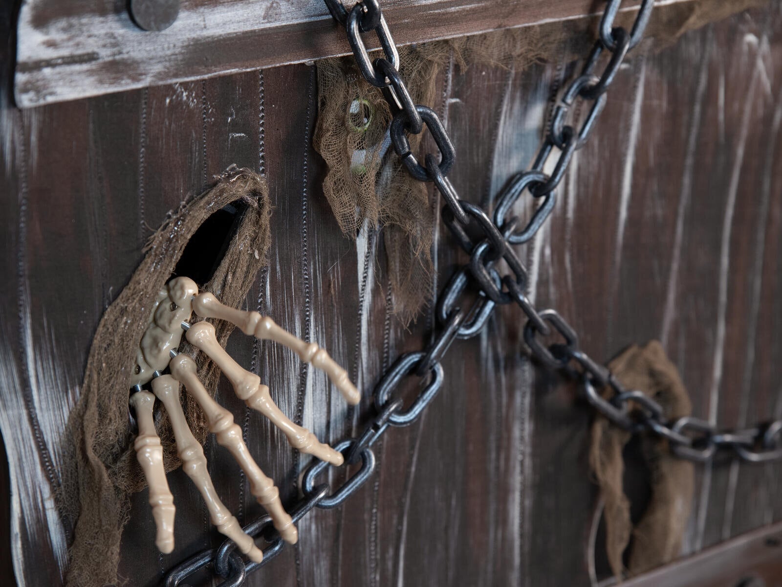 A macabre addition to any Halloween scene. Whether as an eye-catcher in the entrance area, as an eerie prop in a haunted house or as a gruesome shocker at a Halloween party: the "coffin of horror" will send chills down your spine and leave no one unimpressed.Creaking wood and eerie shadows - this coffin hides a dark secret. Once perhaps the final resting place of a criminal, it is now anything but silent. Its rotten boards are riddled with cracks and crevices, as if something had tried to break free from inside with unbridled force. However, two massive chains in the upper area seem to hold back the horror - but is the first impression deceptive? When the animation is activated, the coffin comes to life. A plaintive moan and cries emanate from its interior, while a bony hand reaches through one of the holes in the lid - groping, searching, ready to grab any unwary visitor. At the same time, two eyes peer out through further openings, dimly lit to ominous life.The animation of the Halloween decoration is activated by an integrated microphone or wired control.