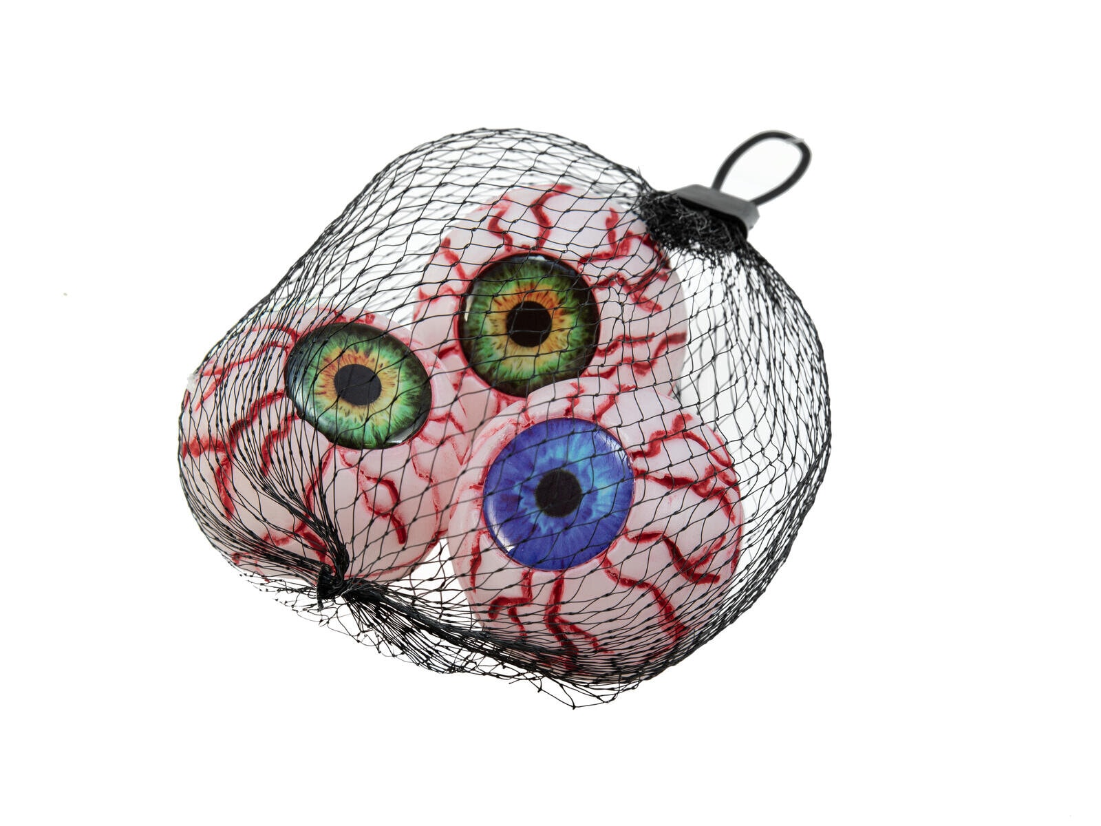 The artificial eyeballs from Europalms offer a wide range of possibilities for your spooky decorations. Whether you want to create a spooky table decoration for your Halloween party or plan a complete scary scene - the eyeballs will not fail to make an impact.The set consists of four detailed eyeballs, two of which have a fascinating blue iris, while the other two impress with an intense shade of green. The white sclera of the eyes is criss-crossed with red veins, creating an authentic and creepy look. They have a diameter of approx. 5 cm and there is a small hole (0.4 cm in diameter) on the underside to stabilize the eyeballs if required. Our artificial eyeballs add an extra dose of spookiness to your decorations and bring them to life.The artificial eyes are supplied in a practical mesh bag, which can also be used for storage.