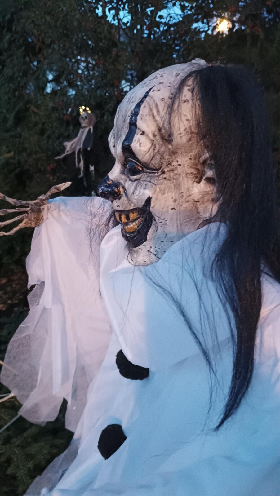 GILDO is no ordinary clown - with his eerie charm and frightening laugh, he will give the guests at your Halloween or theme party goosebumps.The animated Halloween figure from Europalms consists of the torso of a clown in a tattered, white robe with black pom-poms. His head appears in a spooky shade of gray, while his long hair comes in a vibrant shade of black. The typical clown paint is completely black and his broad grin reveals black and yellow teeth. His arms can be effortlessly bent into shape, allowing you to adjust his posture and expression as you wish. The grotesque limbs - skeletal hands with skinny bones that appear almost superhumanly long - also reinforce his eerie appearance. But the creepiest thing about Gildo is his gruesome laugh, which sounds while his eyes flash dangerously red.The deco figure's animation can be activated using the integrated microphone or wired manual control.