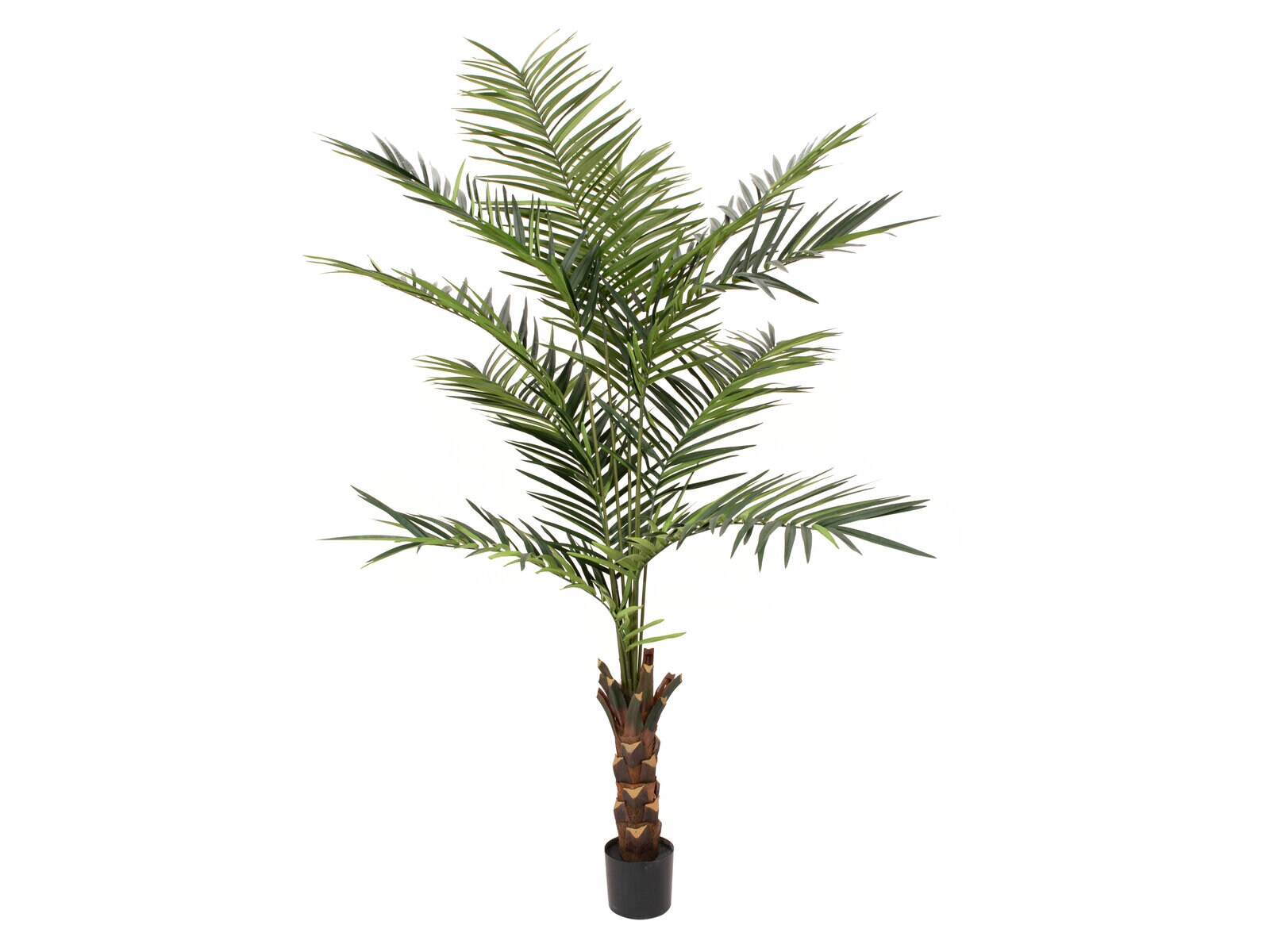 With the artificial Kentia palm you will give your premises a fresh atmosphere without costly maintenance.As a green splash of color, the palm radiates a powerful calm and serenity, especially in the office or home office. In addition, unlike its natural role model, it does not resent a low-light location.The high quality artificial trunk is decorated with real palm fiber material between individual sections of the trunk to achieve the most natural appearance. The flexible palm fronds with leaves made of textile fiber material only need to be inserted into fixtures of different heights when assembling the artificial plant.The palm tree is already delivered in a plain gardener's pot and reaches a total height of approx. 240 cm from the pot to the palm frond tips.