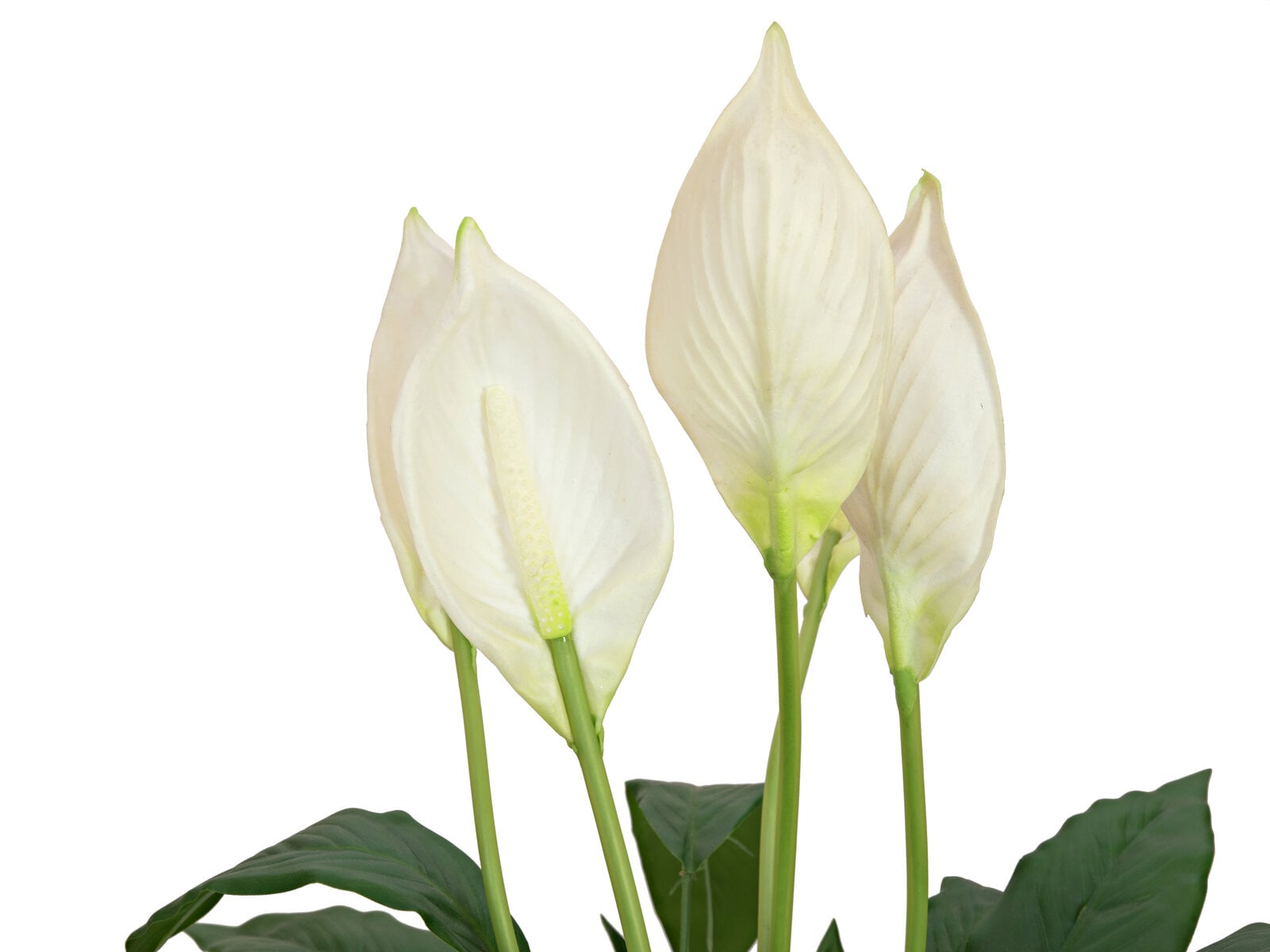 This elegant houseplant is also known as peace lily, leaf flag, or spathiphyllum. It is used in hotels, residential, office, and commercial premises.As in its natural model, this artificial plant has several shoots close together. These form the bushy-looking horst of the solitary plant. Dark green, glossy leaves provide a particularly beautiful contrast to the white to cream-colored bracts. Five of these decorative inflorescences protrude high from the dense foliage and have a very natural feel due to their soft-touch quality.The artificial plant has a total height of about 60 cm and comes in a decorative ceramic planter covered with artificial moss. Thus, cumbersome potting is no longer necessary.
