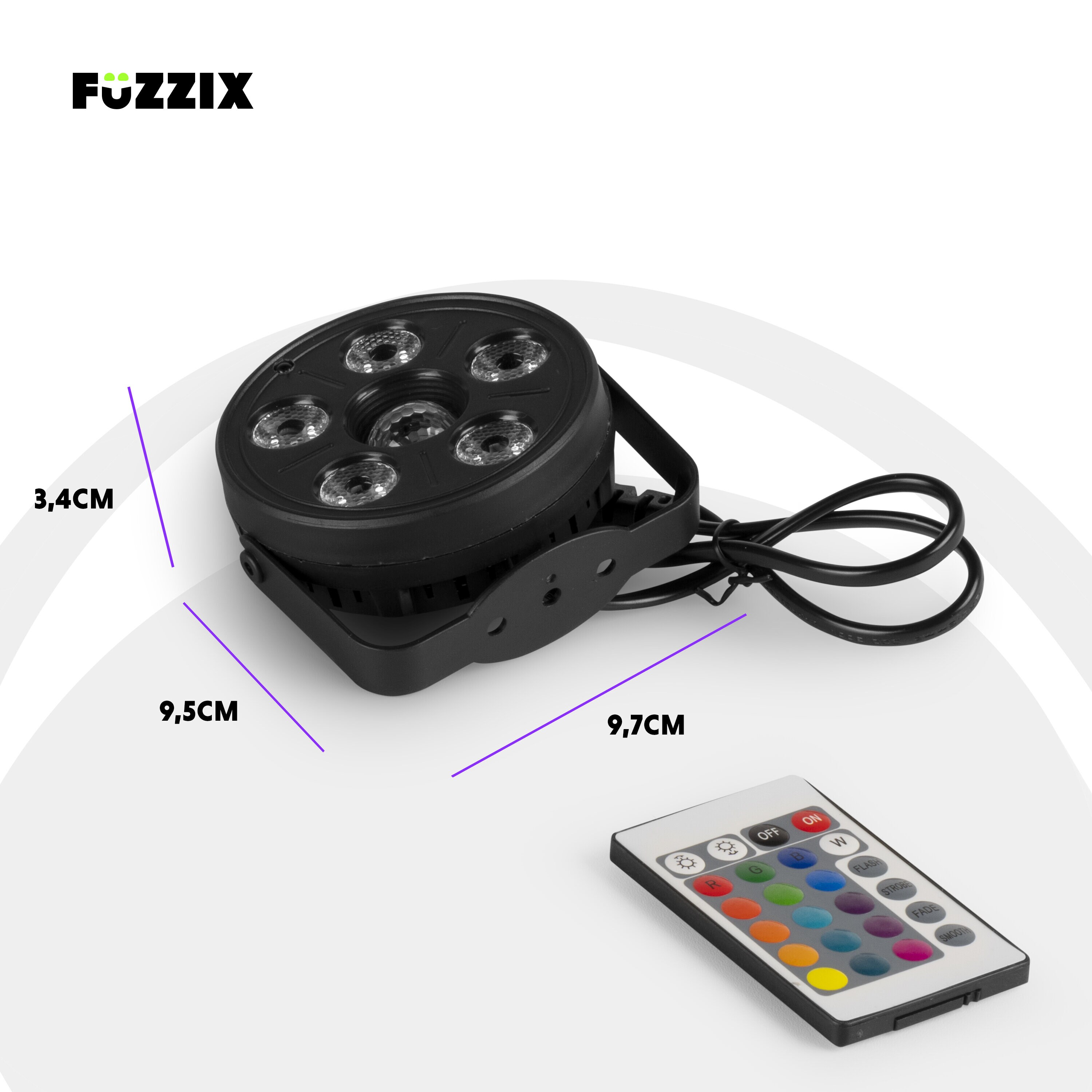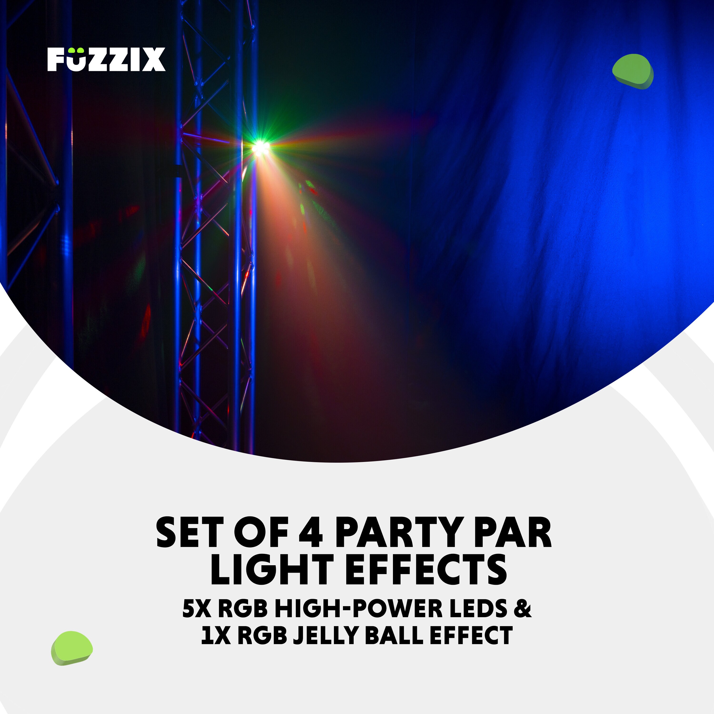 • Fuzzix Comet M06 Party Par Set är ett komplett ljuspaket som förvandlar vilket rum som helst till en festlokal. Setet består av fyra kraftfulla Party Par-effekter med högeffektiva RGB-lysdioder samt en central Jelly Ball-effekt som fyller dansgolvet med färgsprakande ljusmönster. Tack vare den robusta ABS-konstruktionen är enheterna både lätta och hållbara, vilket gör dem enkla att montera och använda vid både hemmafester och mobila events.
