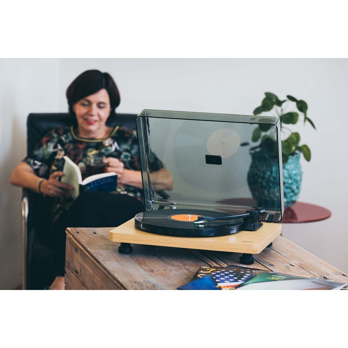 Den trendiga designen och den moderna tekniken gör den här skivspelaren perfekt för alla musikentusiaster.