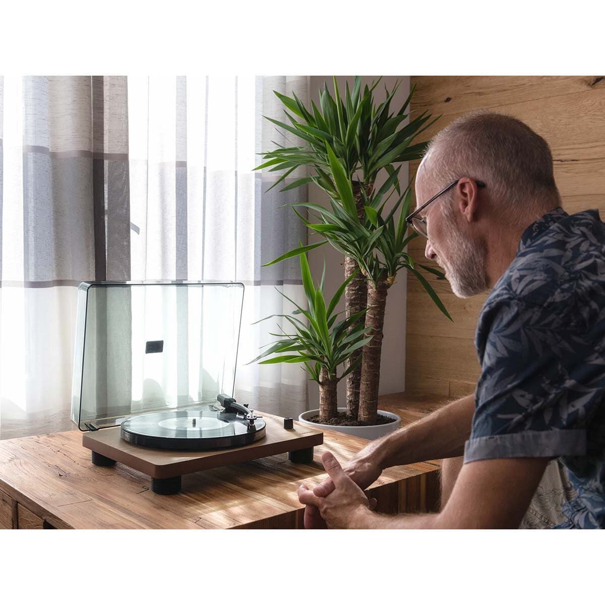 Stilren vinylspelare i trädesign med USB-digitalisering och inbyggd förstärkare