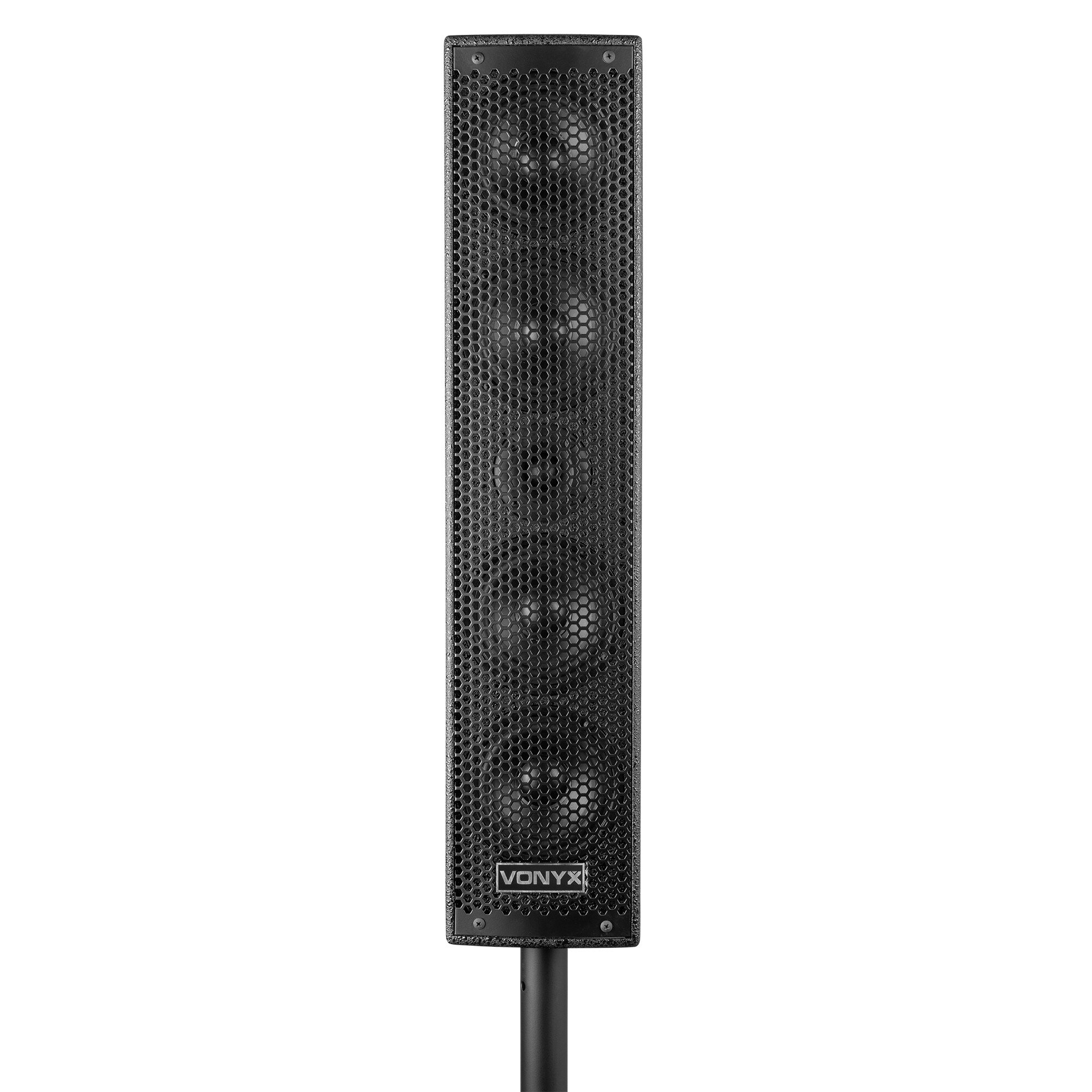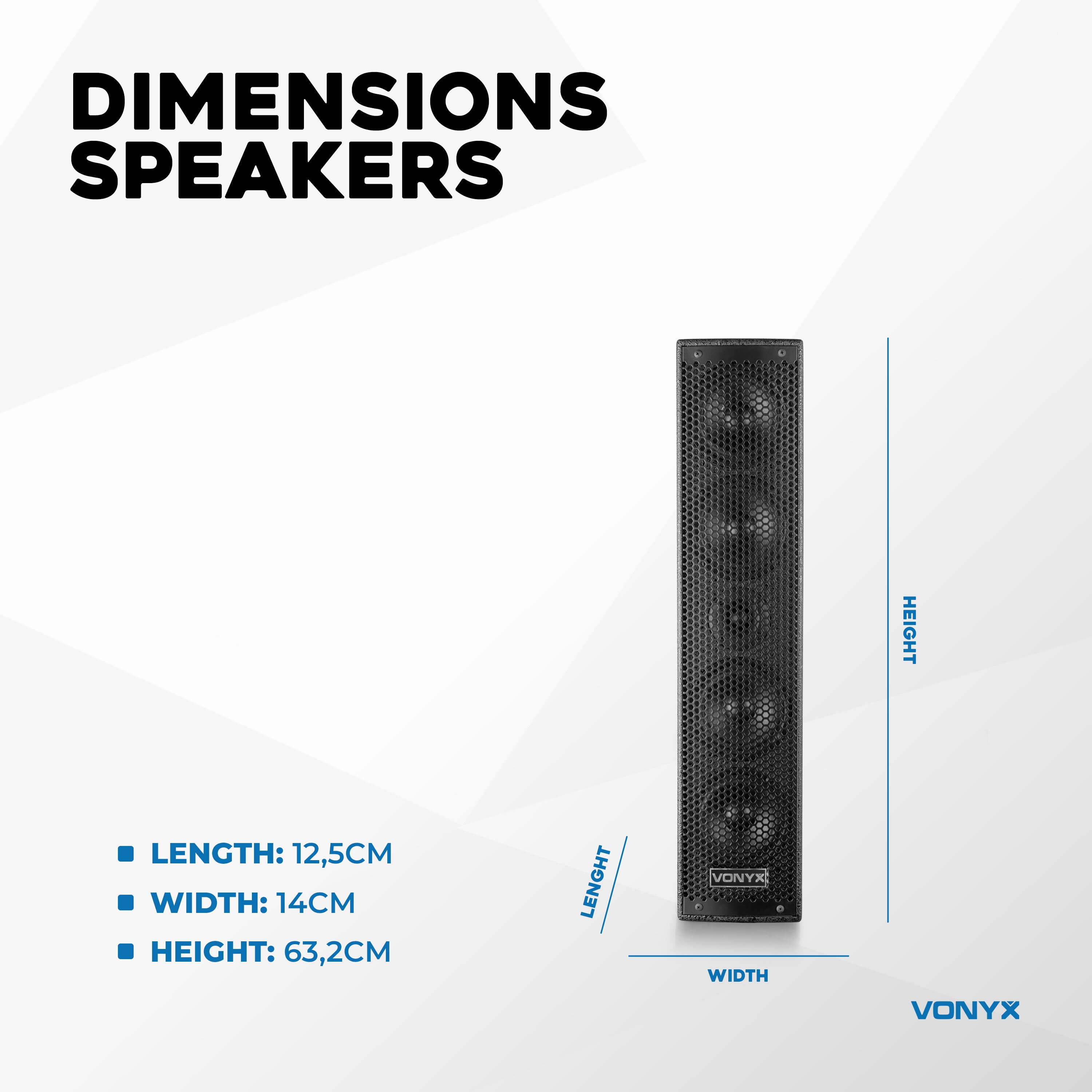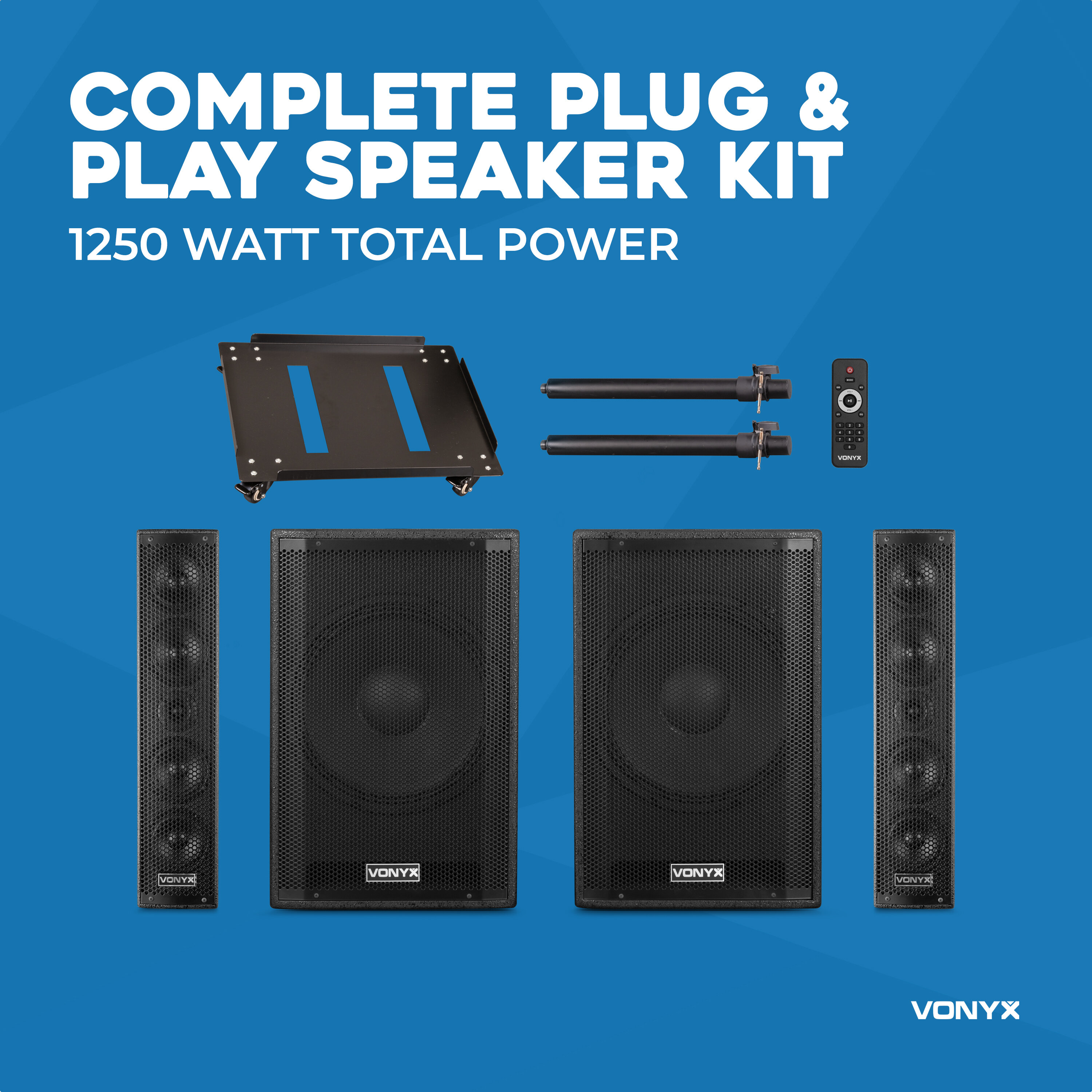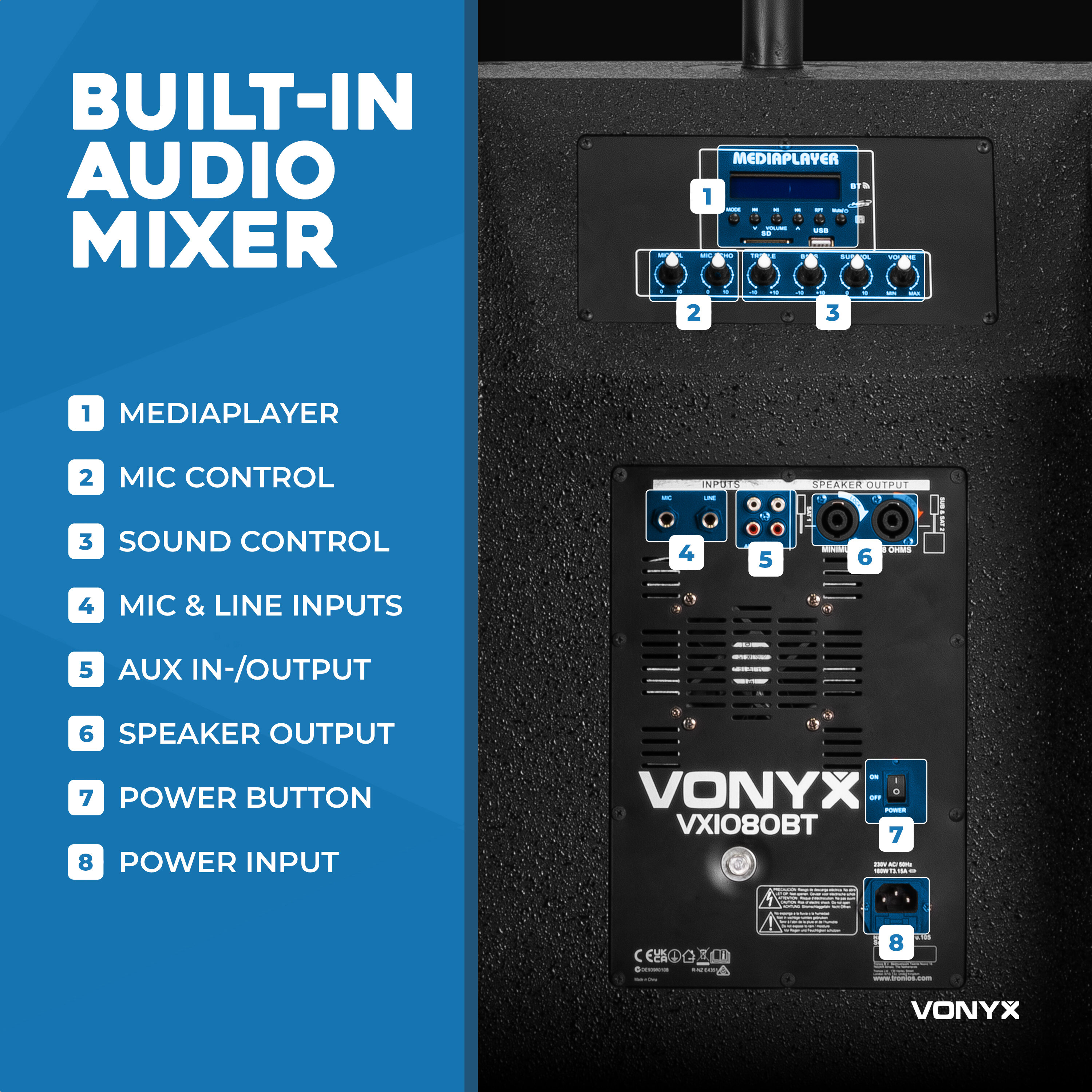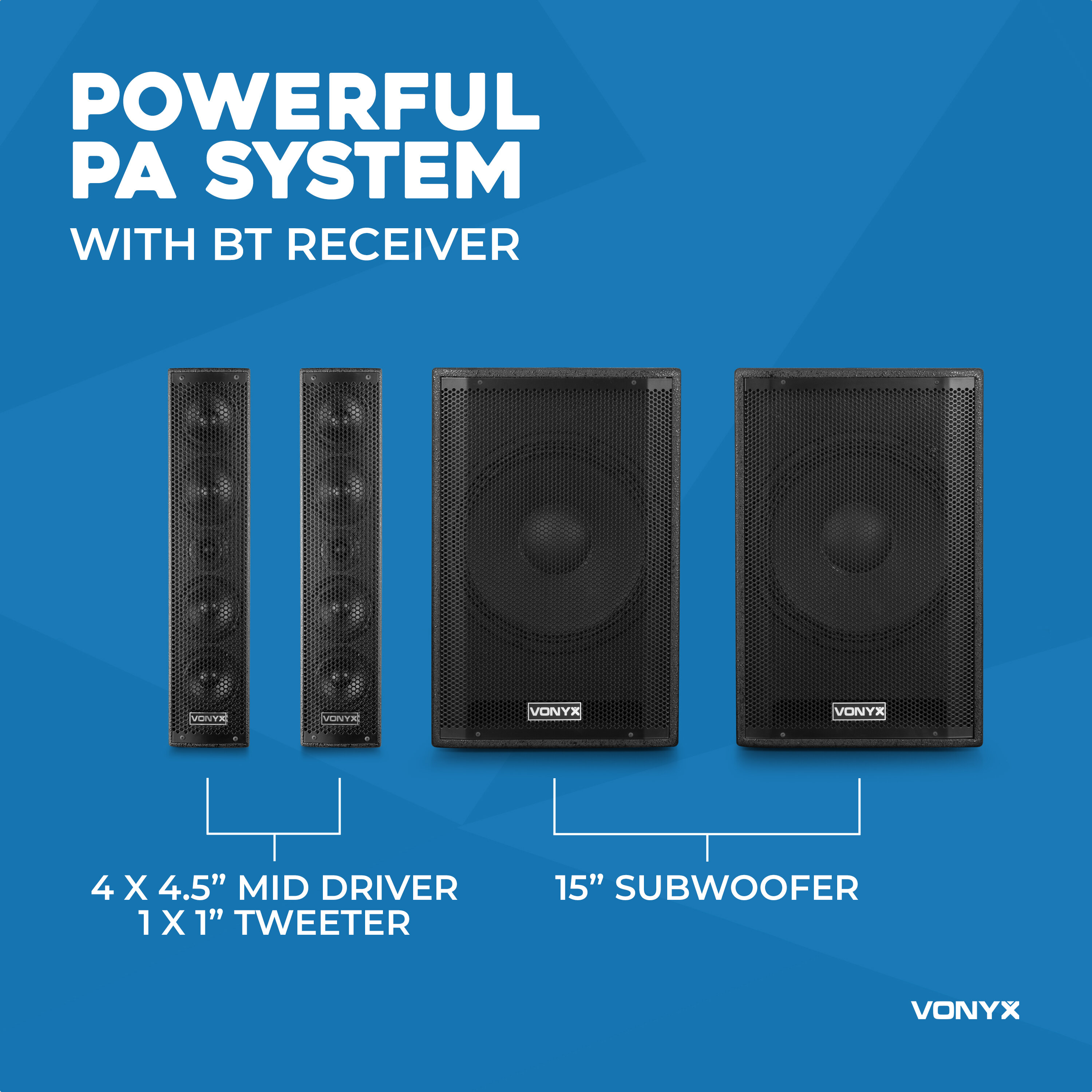 Vonyx VX1080BT är ett komplett plug & play-högtalarsystem som levererar kraftfullt ljud för fester, liveframträdanden och event. Systemet består av två 15" subwoofers (en aktiv och en passiv) samt två toppar med fyra 4,5" mellanregister och en 1" diskant vardera. All förstärkning sitter i den aktiva subwoofern, där även både toppar och passiv sub ansluts, vilket gör installationen snabb och enkel.