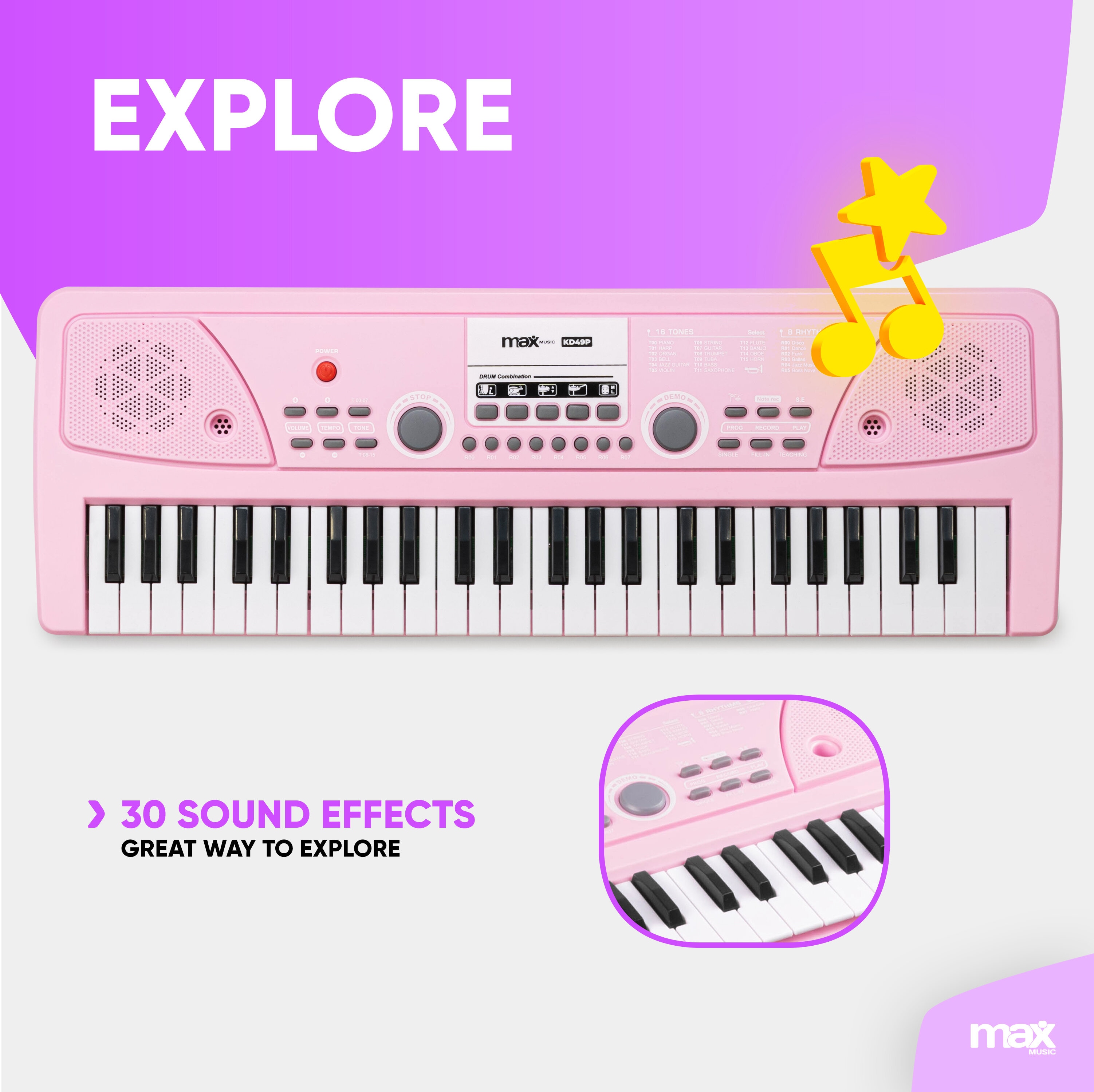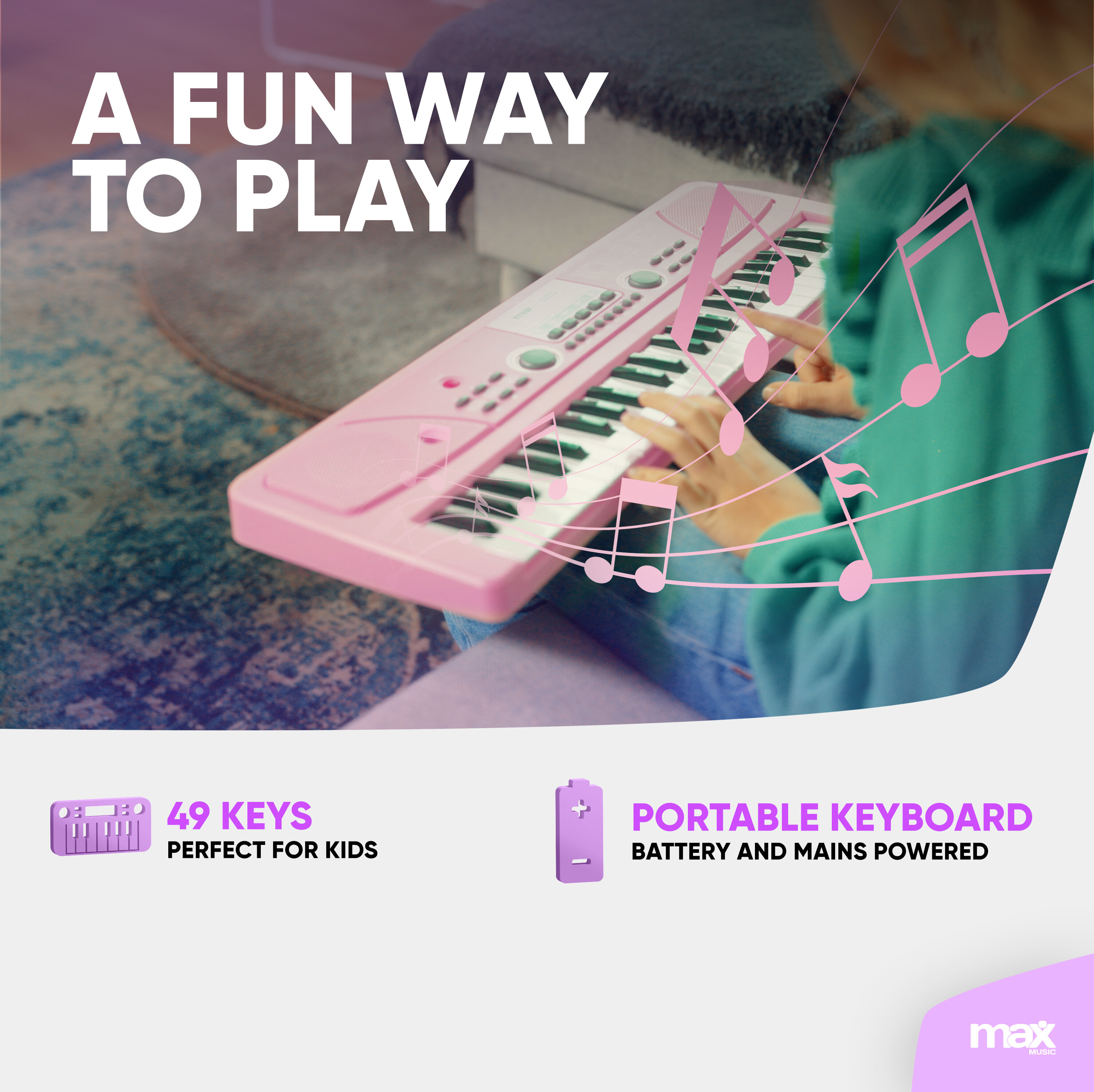 • Upptäck Max KD49 Elektroniskt Keyboard Rosa – ett mångsidigt och kompakt 49-tangenters instrument som passar musiker på alla nivåer. Oavsett om du är nybörjare som utforskar musikens värld eller en erfaren spelare som letar efter ett portabelt keyboard, har KD49 allt du behöver.