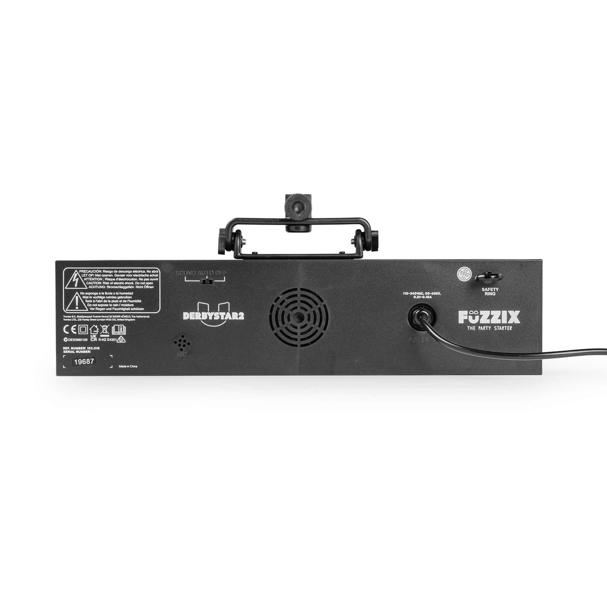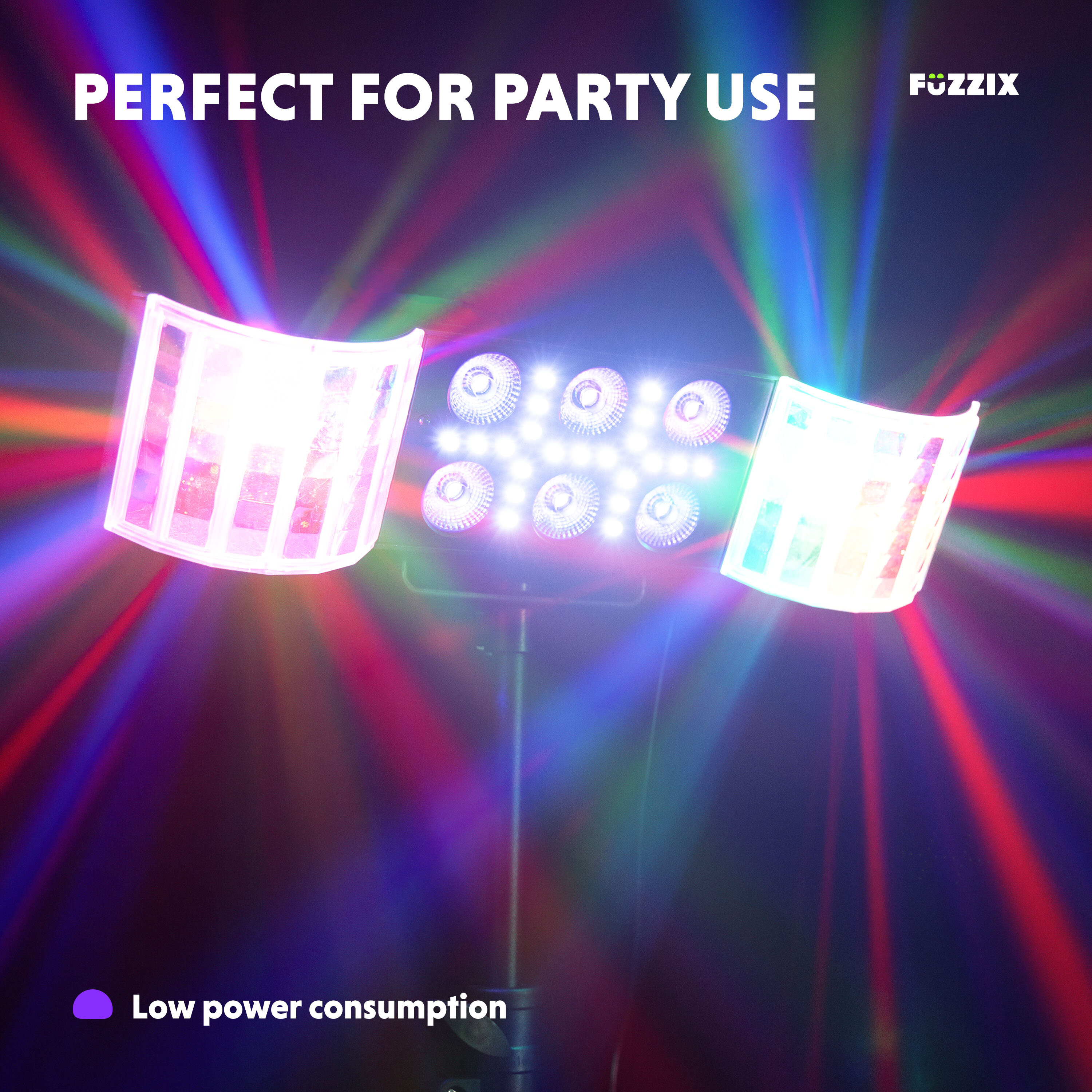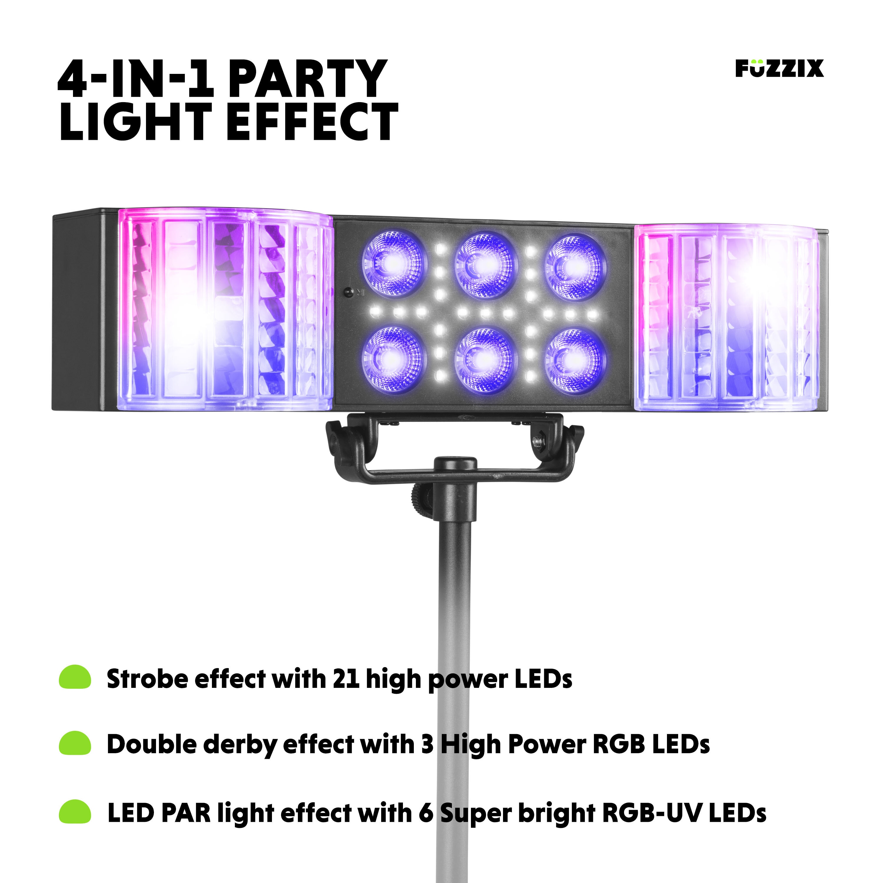 • Fuzzix DerbyStar2 är en mångsidig partybar som kombinerar flera ljuseffekter i en kompakt enhet. Med två kraftfulla derby-effekter, sex PAR-lyseffekter med RGB-UV LEDs och en inbyggd strobe med 21 vita lysdioder levererar den en komplett ljusshow som får alla att vilja dansa.