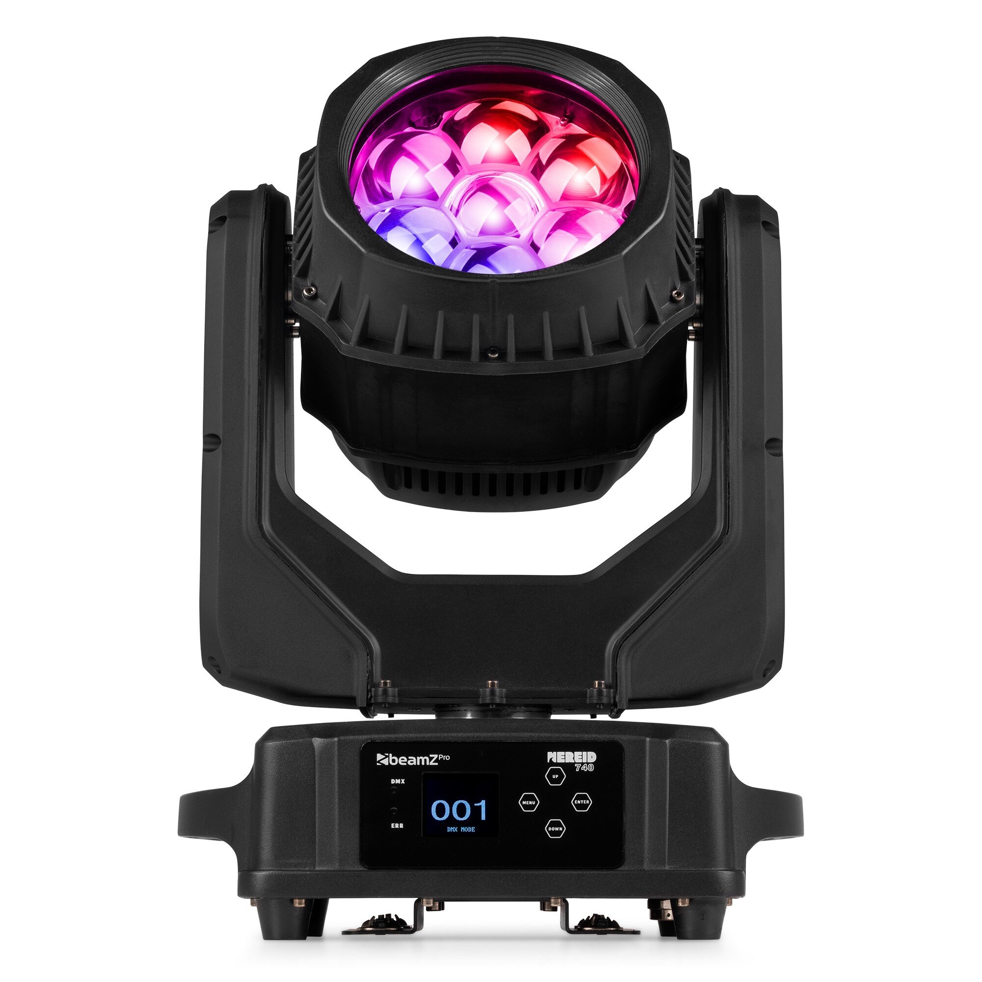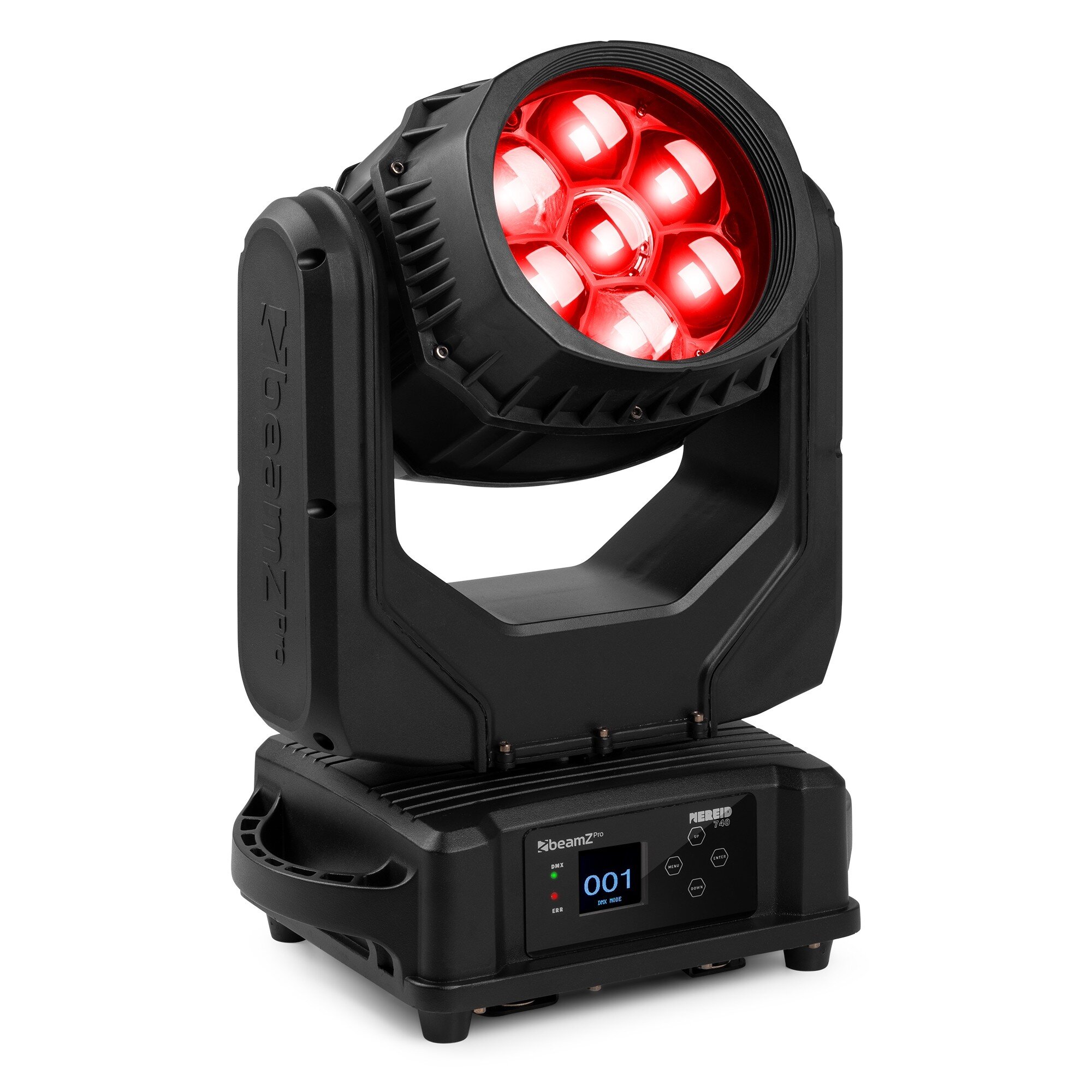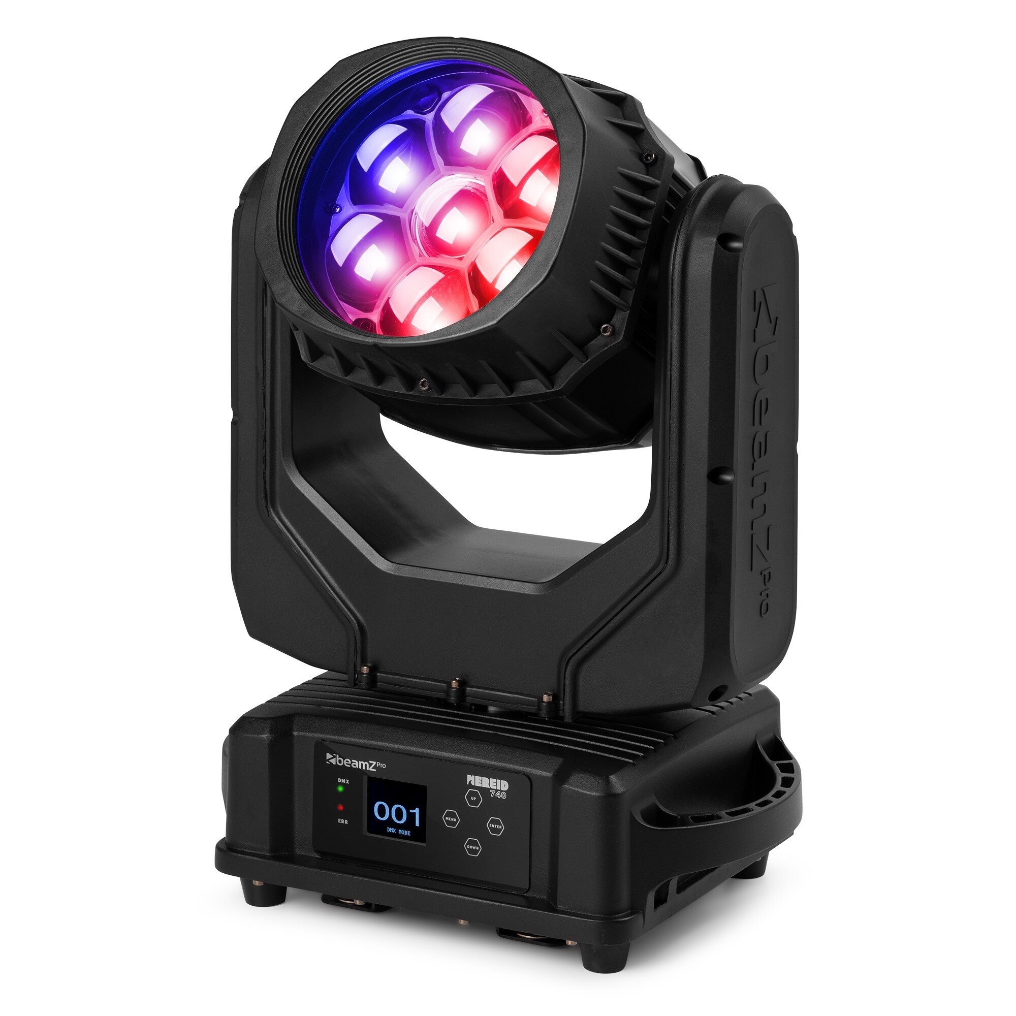 • eamZ Pro Nereid740 är en kraftfull wash/beam moving head utvecklad för professionella produktioner, event och fasta installationer där högt ljusutbyte och driftsäkerhet är avgörande. Armaturen är utrustad med 7 extremt ljusstarka 40 W 4-in-1 RGBW-LEDs enligt senaste teknik och ett linjärt motoriserat zoomsystem. De unika Bee Eye-linserna med honeycomb-design, i kombination med individuell pixelkontroll per LED, möjliggör imponerande Kaleido-effekter samt dynamiska beam- och wash-scener.