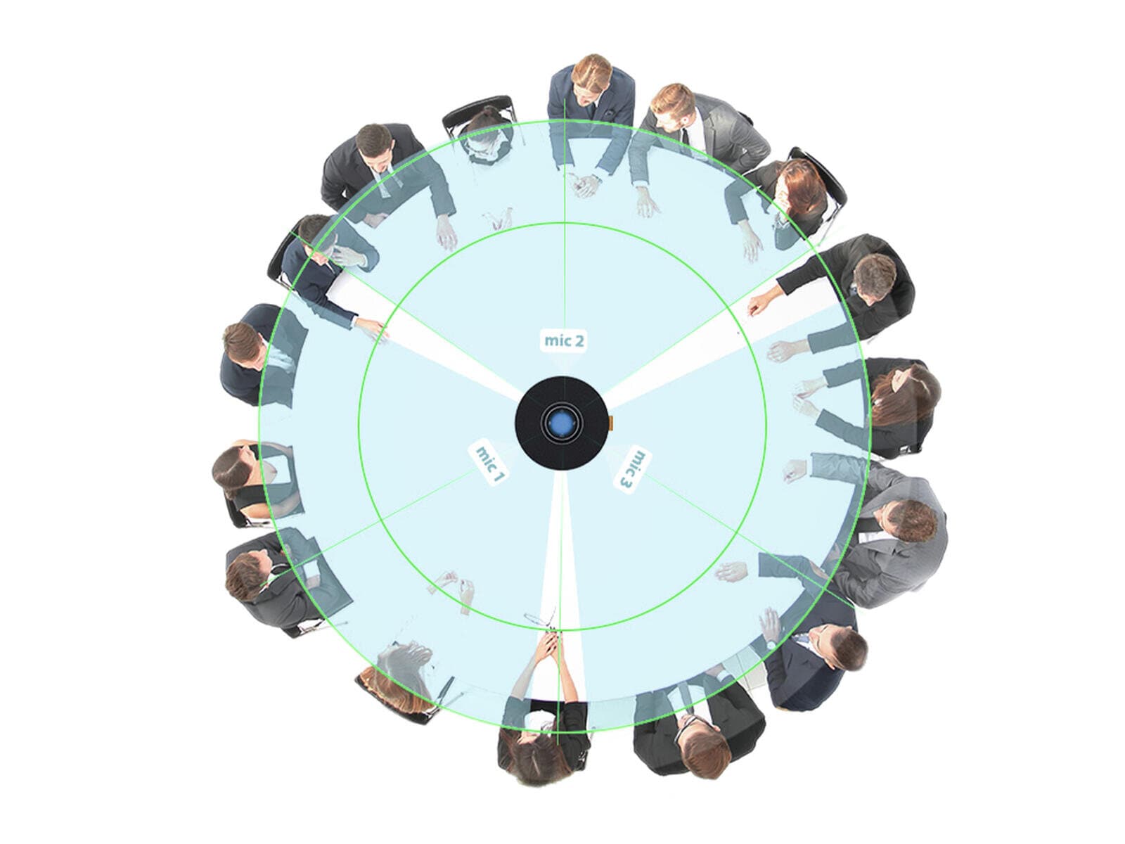 • 360° ljudupptagning med 3 rundupptagande mikrofoner – tydlig röståtergivning inom 3 meters radie